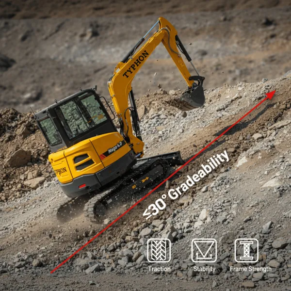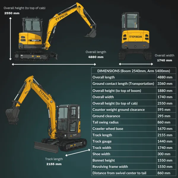 The TYPHON NAGA 4.0 Mini Excavator is a powerful 4-ton compact machine built for urban construction and confined job sites. Its zero-tail swing design, 360° rotation, and compact dimensions allow safe and efficient operation in tight spaces while maintaining excellent stability.