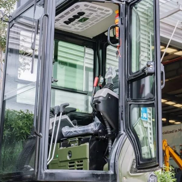 This mini excavator features a smooth Hydraulic System with Pilot Controls, plus a comfortable AC/Heated Cabin for all-weather operation. It includes a Boom Swing (45° left and right) , Retractable Tracks, 450mm Bucket, Hydraulic Thumb Clip and 145 mm ground clearance, giving you precision, versatility, and stable performance in tight or rough environments. Cabin interior measures 900mm in width and 1600mm in height, providing ample space and comfort for the operator during long working hours.